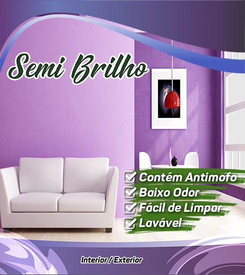TINTA ACRÍLICA SEMIBRILHO: Tinta acrílica de acabamento Liso Semi brilho, baixo odor, de fácil aplicação, secagem rápida e lavável.Indicada para paredes em ambientes interno/externo de alvenaria em geral: reboco, massa, texturas, concreto, gesso entre outras.Produto de ótimo desempenho e com propriedades antimofo, indicado para quem deseja qualidade, economia e ótimo acabamento.